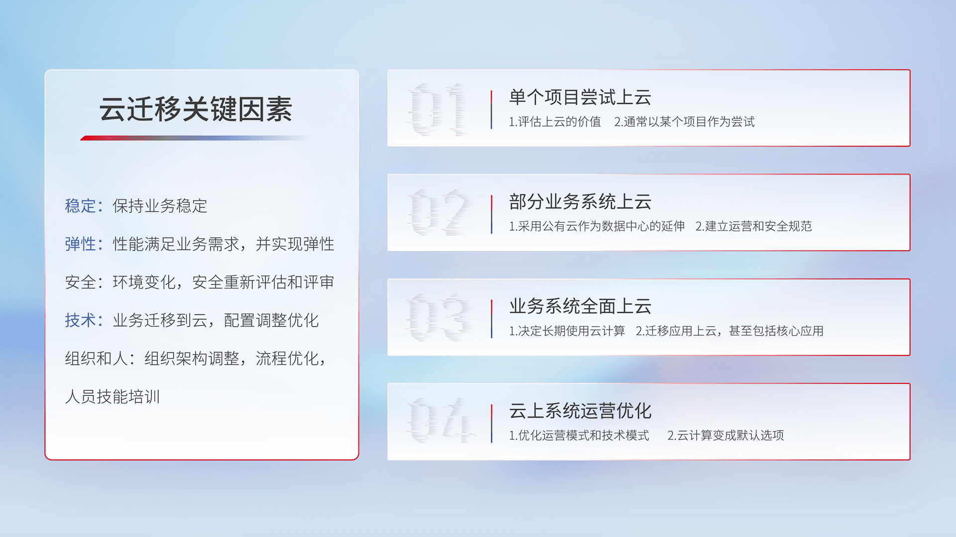 结合实际业务,,,,从规划设计、、云平台选型、、云原生改造、、、、数据迁移、、、、集成交付,,迁移全过程为客户识别最佳上云路径,,做好风险识别管理,,,设计网络架构、、、身份权限、、、安全审计合规、、、、操作审计、、、日志审计、、、监控告警策略、、、多站点容灾设计等,,对云上基础设施进行整体规划,,提升IT治理水平,,以满足弹性、、、、高可用、、高性能的需求。。。。